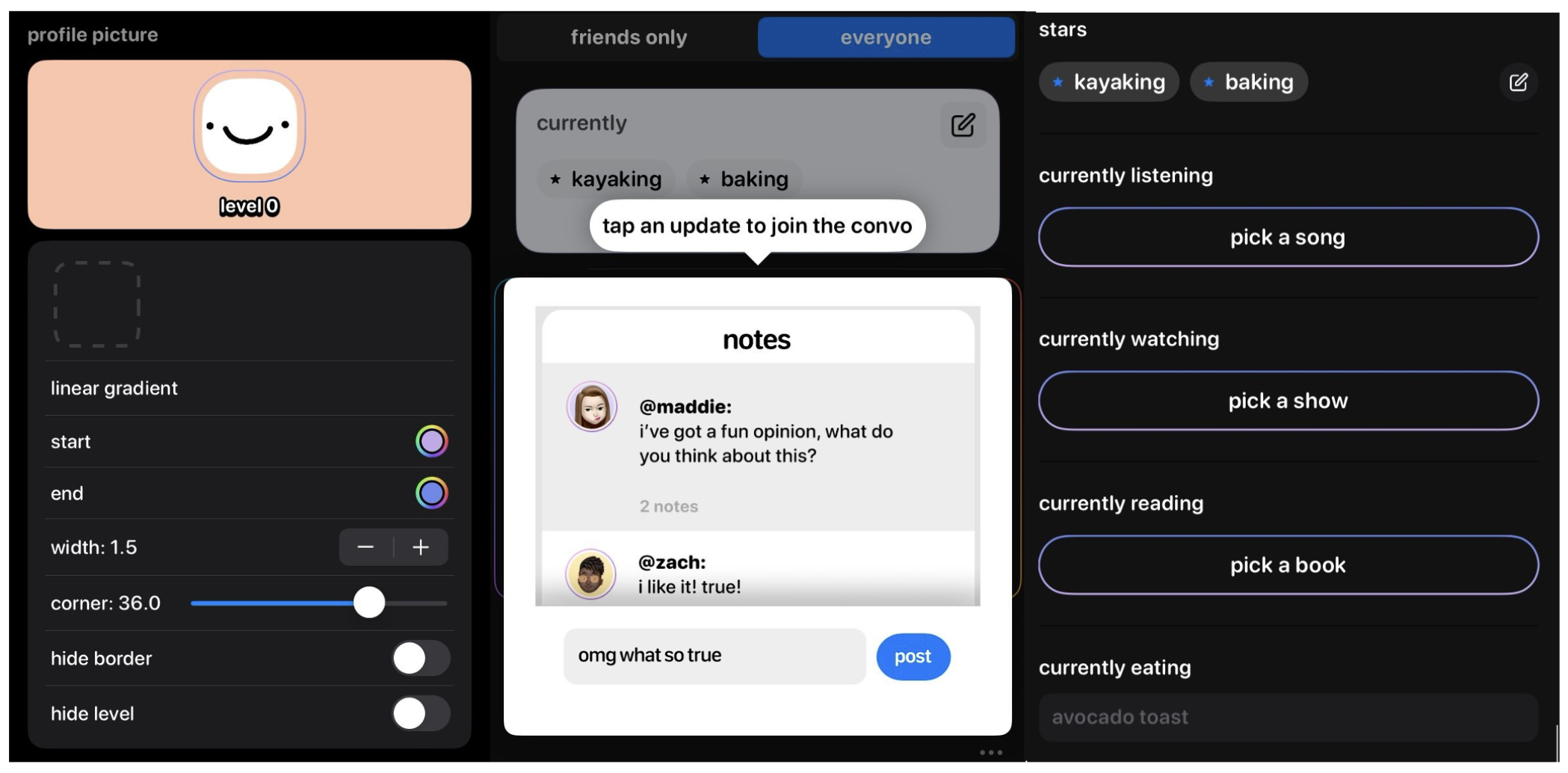 The customization element is not limited to favorite pastimes. Users have the ability to edit and personalize everything from profile color to featured music choices, as well as share updates that outline a user’s current “vibe” and how they may be feeling, acting, and thinking with the world. In a nod to the social media networks of the past, the focus is on sharing your journey with your inner circle instead of circulating content with the world around you.